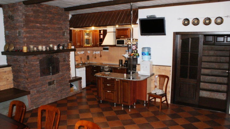 В цокольном этаже коттеджа расположена кухня-столовая с настоящей дровяной печью–камином. В обеденном зале могут разместиться одновременно 20-25 человек. Гости могут как самостоятельно приготовить себе еду, так и сделать заказ. Для вас с душой и любовью приготовят вкусные и сытные блюда традиционной русской кухни.