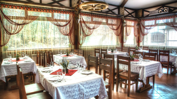 На территории базы отдыха расположен ресторан, меню которого составлено по рецептам кавказской и европейской кухни. На выбор представлены завтраки, салаты, холодные закуски, горячие вторые блюда, супы, десерты и множество напитков. Блюда можно заказать предварительно к приходу по телефону.