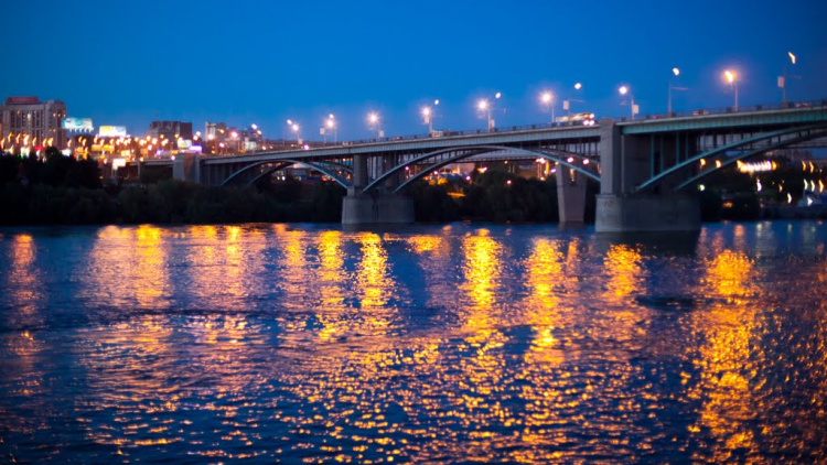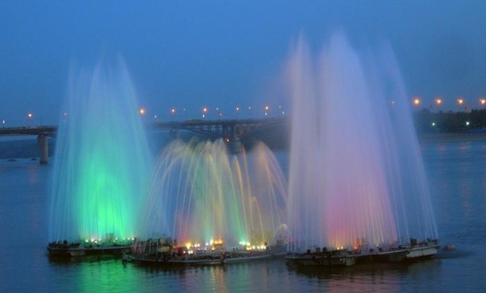 Новосибирск особенно красив в вечернее время, когда фонтаны, днём кажущиеся абсолютно обыкновенными, начинают подсвечиваться и петь – получается настоящее светомузыкальное представление. Также подсветка установлена и на мосты – Дмитровский и Октябрьский.