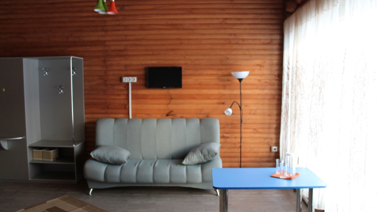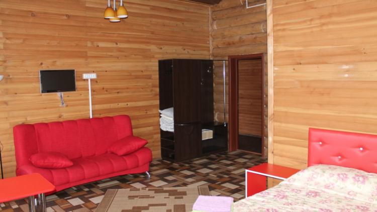 Однокомнатный просторный номер, общей площадью 30 кв. м. В уютной комнате большая двухспальная кровать и мягкий диван. В номере чувствуется запах натурального дерева, благодаря интерьерной отделке. В номере вся необходимая современная мебель и ЖК телевизор.