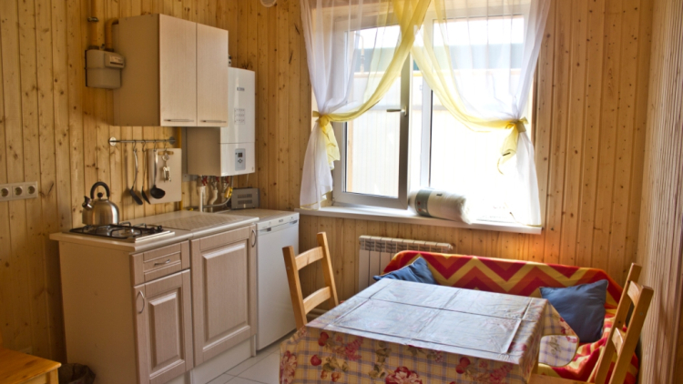 В домике есть полностью оборудованная кухонная зона с плитой, холодильником и необходимой посудой. Рядом с домом можно пожарить шашлык и насладиться сочным мясом на свежем воздухе.