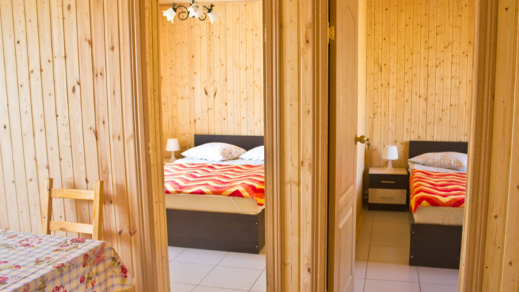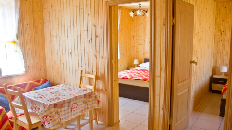 Уютный благоустроенный домик с газовым отоплением на 4 человека. Две раздельные комнаты, в каждой комнате двуспальная кровать, спутниковое ТВ. Возможно размещение 2 человек на раскладном диване. Отдельная гостиная с необходимой мебелью и кухонной зоной, есть холодильник, посуда, газовая плита. Оборудованный санузел - душ, туалет, умывальник. Рядом с каждым домиком есть своя отдельная территория со столом и скамейками.